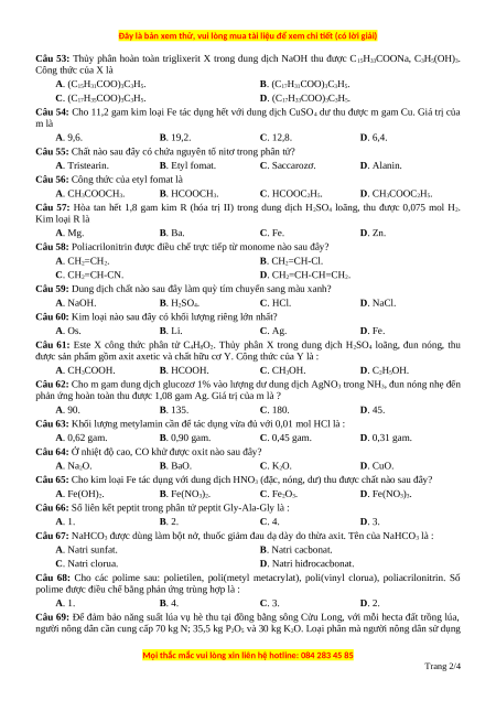 Câu 53: Thủy phân hoàn toàn triglixerit X trong dung dịch NaOH thu được C15H33COONa, C3H5(OH)3. Công thức của X là