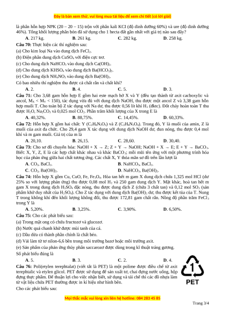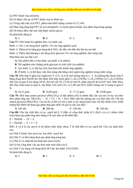 Câu 76: Poli(etylen terephtalat) (viết tắt là PET) là một polime được điều chế từ axit