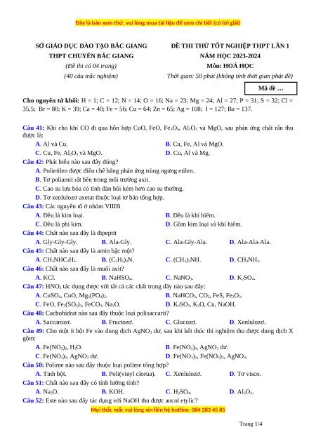 Đề thi thử tốt nghiệp Hóa học trường THPT Chuyên Bắc Giang lần 1 năm 2024