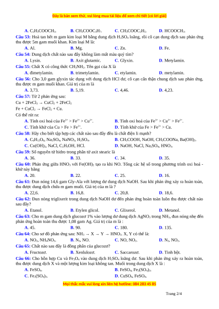 Câu 56: Cho 3,0 gam glyxin tác dụng với dung dịch HCl dư, cô cạn cẩn thận chung dịch sau phản ứng,