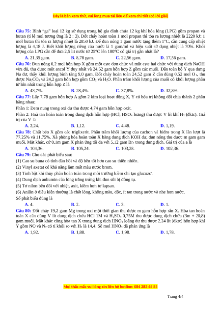 Câu 78: Chất béo X gồm các triglixerit. Phần trăm khối lượng của cacbon và hiđro trong X lần lượt là