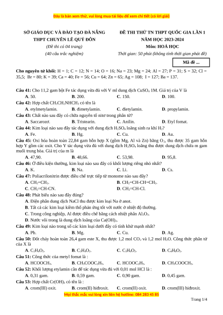 Đề thi thử tốt nghiệp Hóa học trường THPT Chuyên Lê Quý Đôn - Đà Nẵng lần 1 năm 2024