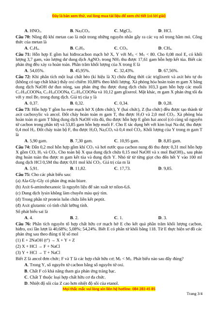 Câu 72: Khi phân tích một loại chất béo (kí hiệu là X) chứa đồng thời các triglixerit và axit béo tự do