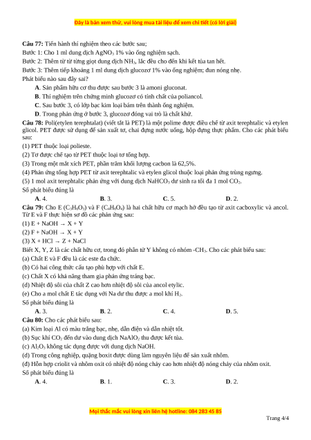 Câu 78: Poli(etylen terephtalat) (viết tắt là PET) là một polime được điều chế từ axit terephtalic và etylen