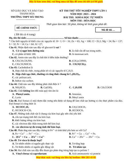 Đề thi thử tốt nghiệp Hóa học trường THPT Hà Trung lần 1 năm 2024