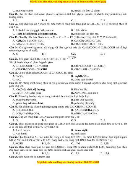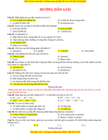 Câu 51. Cho các chất: etyl fomat, glucozơ, saccarozơ, tinh bột, glyxin, protein. Số chất bị thủy phân trong môi trường axit là A. 6 B. 4 C. 1 D. 2
