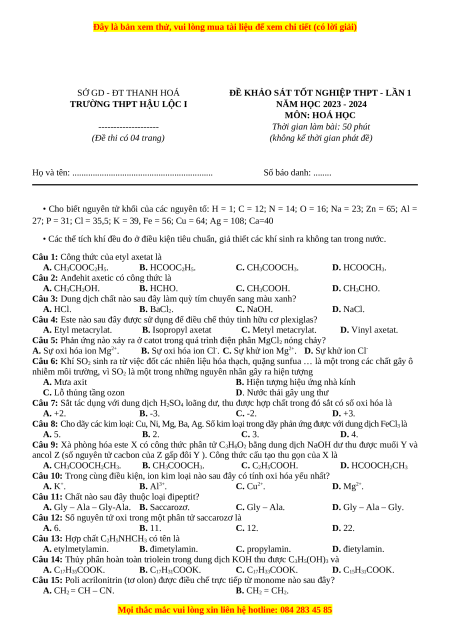 TRƯỜNG THPT HẬU LỘC I NĂM HỌC 2023 - 2024 MÔN: HOÁ HỌC --------------------