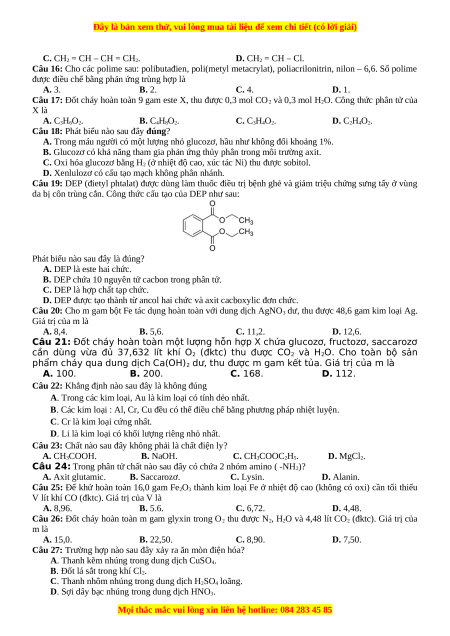 Câu 19: DEP (đietyl phtalat) được dùng làm thuốc điều trị bệnh ghẻ và giảm triệu chứng sưng tấy ở vùng
