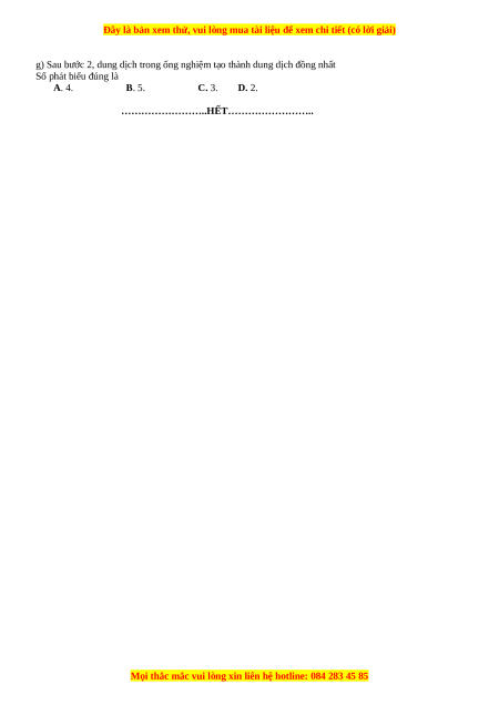 (g) Thực hiện phản ứng trùng ngưng các amino axit đều thu được peptit. Số phát biểu đúng là A. 2. B. 4. C. 3. D. 5.