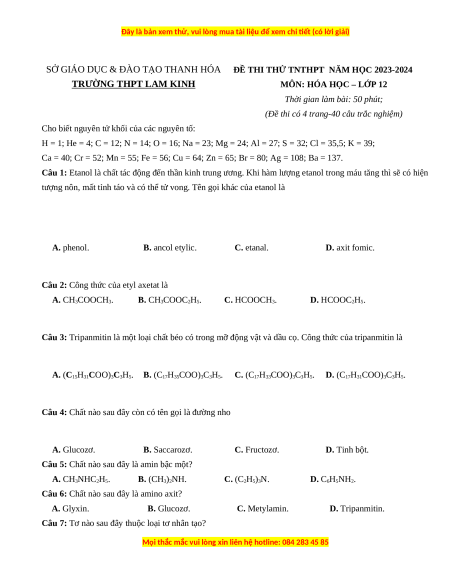 Đề thi thử tốt nghiệp Hóa học trường THPT Lam Kinh lần 1 năm 2024