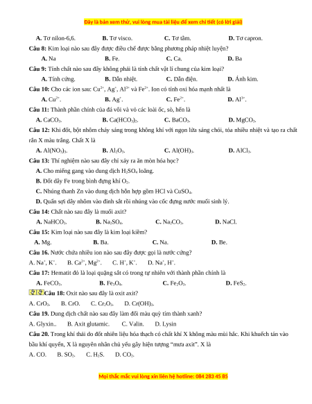 Câu 8: Kim loại nào sau đây được điều chế được bằng phương pháp nhiệt luyện? A. Na B. Fe. C. Ca. D. Ba