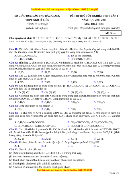Đề thi thử tốt nghiệp Hóa học trường THPT Ngô Sĩ Liên - Bắc Giang lần 1 năm 2024