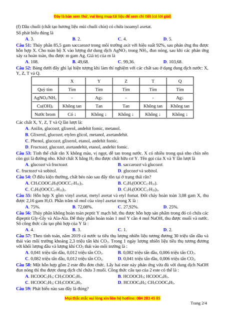 Câu 52: Bảng dưới đây ghi lại hiện tượng khi làm thí nghiệm với các chất sau ở dạng dung dịch nước: X, Y, Z, T và Q. X Y Z T Q Quỳ tím Tím Tím Tím Tím Tím AgNO3/NH3 - Ag↓ - - Ag↓ Cu(OH)2 Không tan Tan Tan Không tan Không tan Nước brom Có ↓ Không ↓ Không ↓ Không ↓ Không ↓