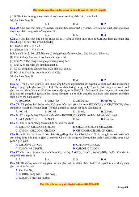 Câu 70: Cho các chất sau: etyl axetat, tripanmitin, saccarozơ, etylamin, Gly-Ala. Số chất tham gia phản