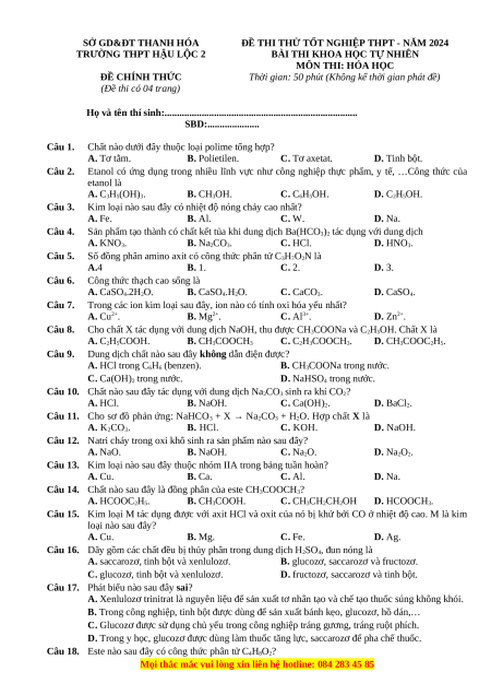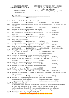 Đề thi thử tốt nghiệp Hóa học trường THPT Trần Phú - Hậu Lộc 2 lần 1 năm 2024