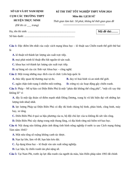 Đề thi thử tốt nghiệp Lịch sử cụm các trường THPT huyện Trực Ninh - Nam Định năm 2024