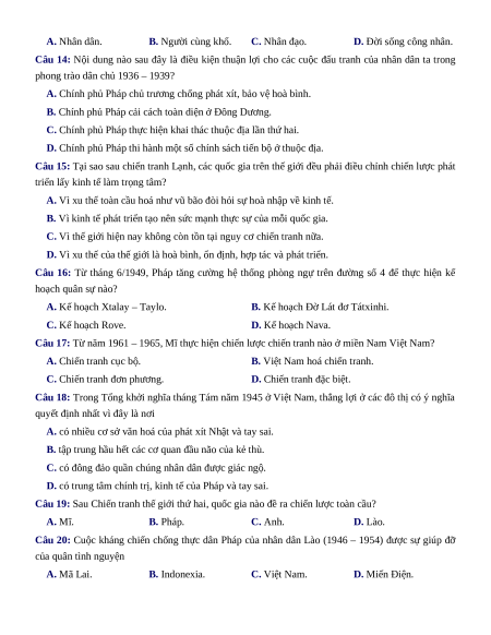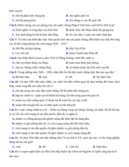 Câu 9: Trong những năm 1945 – 1950, nhân dân Ấn Độ đấu tranh chống thực dân nào sau đây? A. Bồ Đào Nha. B. Anh. C. Bỉ. D. Tây Ban Nha.