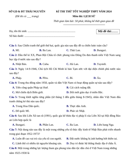 Đề thi thử tốt nghiệp Lịch sử Sở GD&ĐT Thái Nguyên năm 2024
