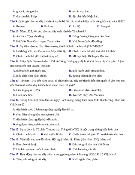 Câu 9: Quốc gia nào sau đây ở châu Á tuyên bố độc lập và thành lập nước cộng hòa vào năm 1950? A. Rumani. B. Ba Lan. C. Ấn Độ. D. Bungari.