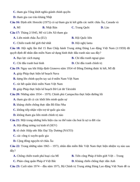 Câu 16: Định ước Henxiki (1975) có sự tham gia kí kết giữa các nước châu Âu, Canada và A. Mĩ B. Nhật Bản C. Trung Quốc D. Lào