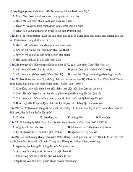 Câu 23: Cuối năm 1974 – đầu năm 1975, Bộ Chính trị Trung ương Đảng Lao động Việt Nam đề ra