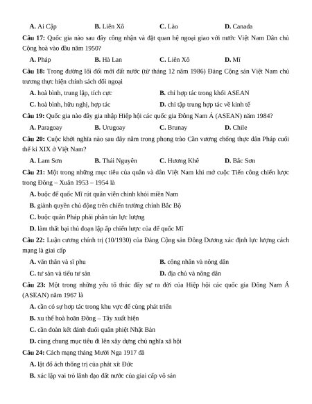 Câu 20: Cuộc khởi nghĩa nào sau đây nằm trong phong trào Cần vương chống thực dân Pháp cuối thế kỉ XIX ở Việt Nam? A. Lam Sơn B. Thái Nguyên C. Hương Khê D. Bắc Sơn