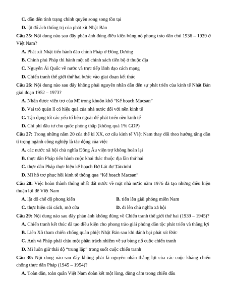Câu 25: Nội dung nào sau đây phản ánh đúng điều kiện bùng nổ phong trào dân chủ 1936 – 1939 ở Việt Nam?