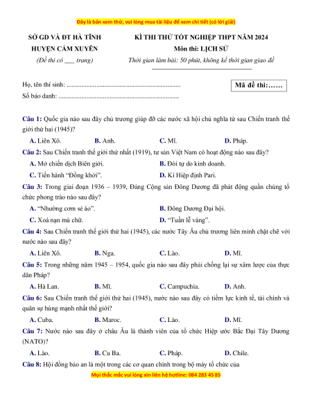 Đề thi thử tốt nghiệp Lịch sử Sở Hà Tĩnh - Huyện Cẩm Xuyên năm 2024