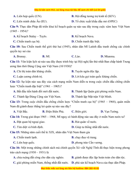 Câu 10: Sau Chiến tranh thế giới thứ hai (1945), nhân dân Mĩ Latinh đấu tranh chống các chính quyền tay sai của A. Brunay. B. Mĩ. C. Lào. D. Mianma.