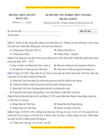 Đề thi thử tốt nghiệp Lịch sử trường THPT Chuyên Hưng Yên năm 2024