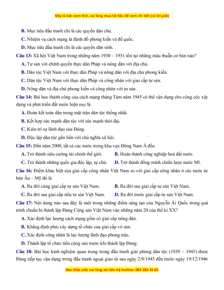 Câu 13: Xã hội Việt Nam trong những năm 1930 – 1931 tồn tại những mâu thuẫn cơ bản nào?