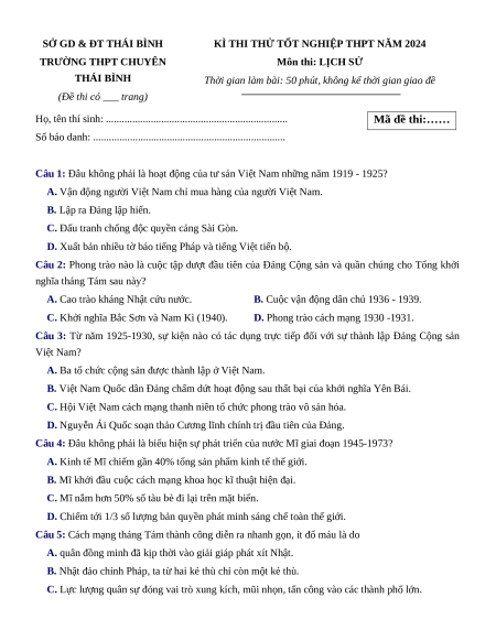 Đề thi thử tốt nghiệp Lịch sử trường THPT Chuyên Thái Bình năm 2024