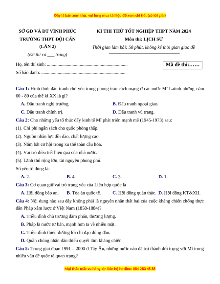 Đề thi thử tốt nghiệp Lịch sử trường THPT Đội Cấn - Vĩnh Phúc lần 2 năm 2024