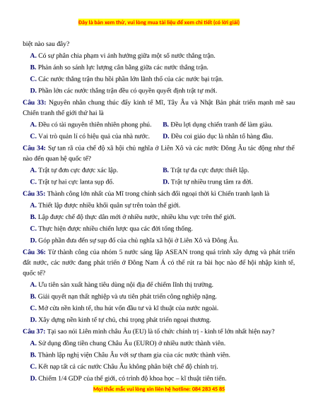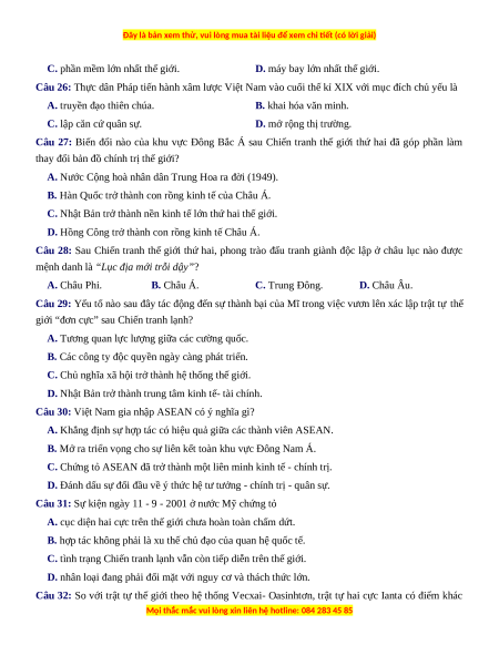 Câu 16: Sau Chiến tranh thế giới thứ hai kẻ thù chủ yếu của phong trào giải phóng dân tộc ở Đông Nam Á là gì? A. Anh. B. Pháp. C. Mĩ. D. Hà Lan.