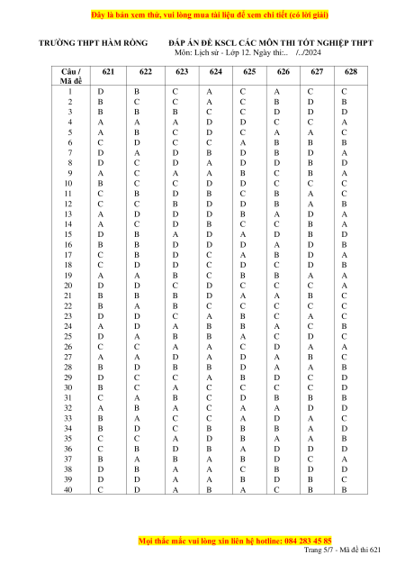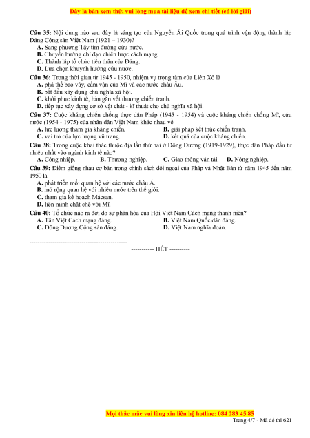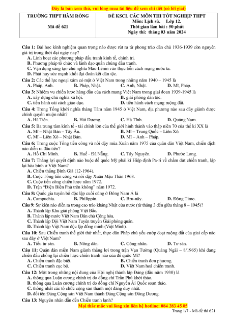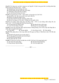 Môn: Lịch sử. Lớp 12. Mã đề 621