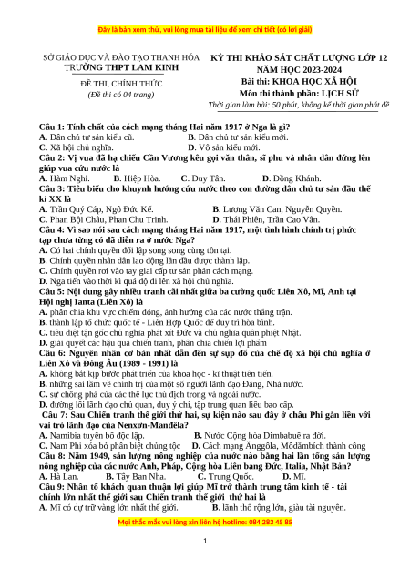Đề thi thử tốt nghiệp Lịch sử trường THPT Lam Kinh lần 1 năm 2024