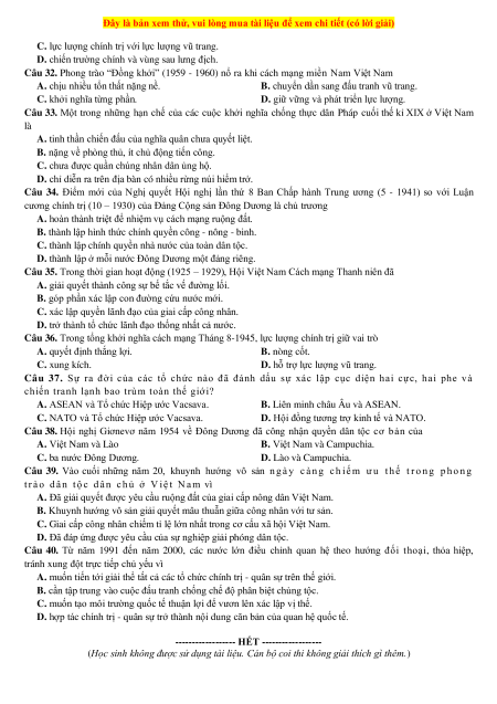 Câu 36. Trong tổng khởi nghĩa cách mạng Tháng 8-1945, lực lượng chính trị giữ vai trò