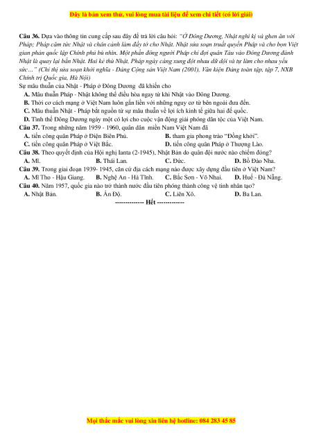 Câu 36. Dựa vào thông tin cung cấp sau đây để trả lời câu hỏi: “Ở Đông Dương, Nhật nghi kị và ghen ăn với