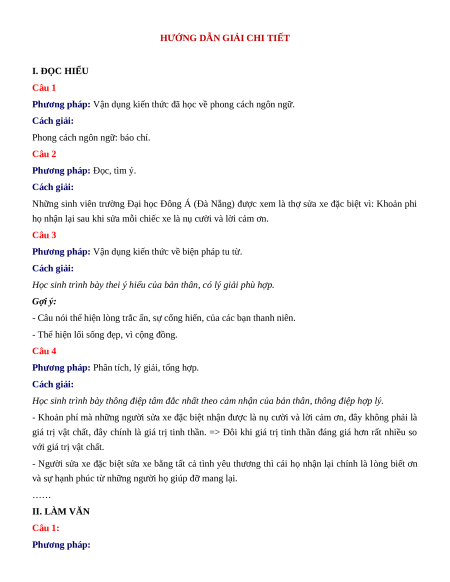 HƯỚNG DẪN GIẢI CHI TIẾT I. ĐỌC HIỂU Câu 1