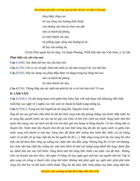 + Kỹ năng tạo lập văn bản (đoạn văn nghị luận xã hội, bài văn nghị luận văn học) I. ĐỌC HIỂU Những căn nhà ấy Đâu rồi những căn nhà