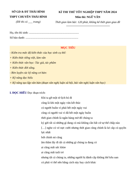 Đề thi thử tốt nghiệp Ngữ Văn THPT Chuyên Thái Bình năm 2024