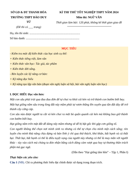 Đề thi thử tốt nghiệp Ngữ Văn THPT Đào Duy Từ - Sở GD&ĐT Thanh Hóa năm 2024