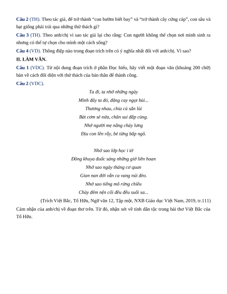 Cảm nhận của anh/chị về đoạn thơ trên. Từ đó, nhận xét về tính dân tộc trong bài thơ Việt Bắc của Tố Hữu. 3