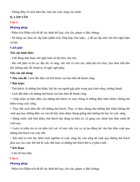 - Thông điệp về cách nắm bắt, làm chủ cuộc sống của mình. II. LÀM VĂN Câu 1: Phương pháp: