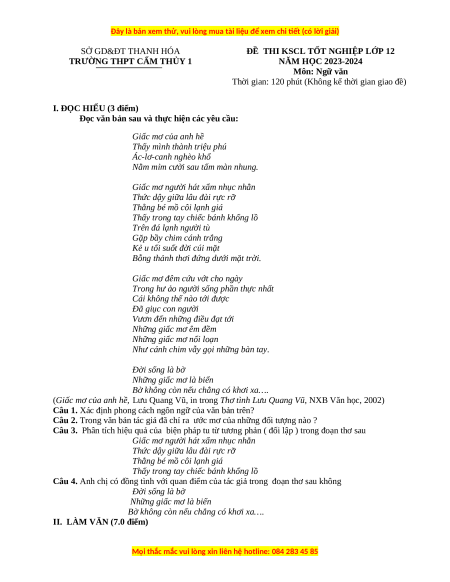 Đề thi thử tốt nghiệp Ngữ Văn trường THPT Cẩm Thủy 1 năm 2024