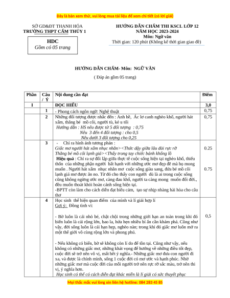 TRƯỜNG THPT CẨM THỦY 1 NĂM HỌC 2023-2024 Môn: Ngữ văn HDC