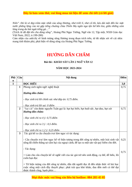 Bài thi : KHẢO SÁT LẦN 2 NGỮ VĂN 12 NĂM HỌC 2023-2024 Phầ Câu Nội dung Điểm n I ĐỌC HIỂU 3,0 1