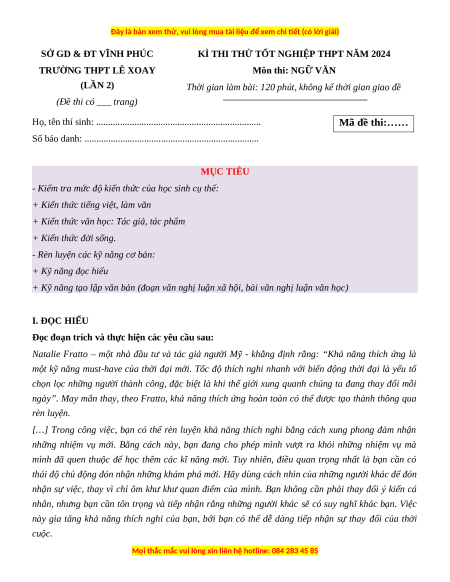 Đề thi thử tốt nghiệp Ngữ Văn trường THPT Lê Xoay - Sở GD&ĐT Vĩnh Phúc lần 2 năm 2024