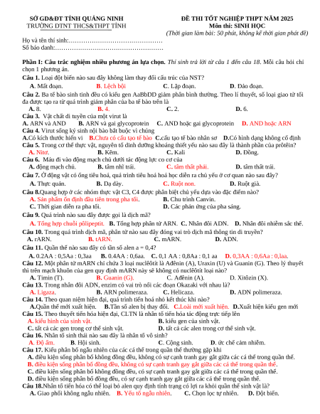 Đề thi thử tốt nghiệp Sinh học 2025 Sở Quảng Ninh
