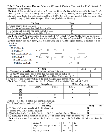 gây bệnh bệnh P, alen b gây bệnh Q. Các alen trội tương ứng là A, B không gây bệnh (A, B trội hoàn toàn so với a và b). Nội dung Đúng Sai